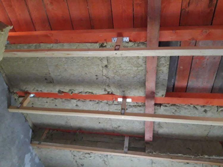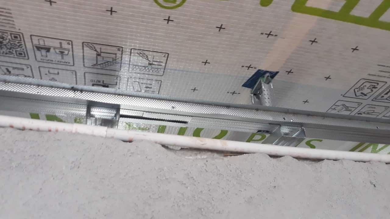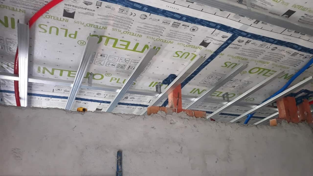 După asta, am montat și profilele de aluminiu. Sistemul de profile a fost prins de sistemul de lemn. Avem nevoie de el ca să putem agăța plăcile de gips carton, ca să avem un tavan frumos. Am etanșat și străpungerile rezultate din acest proces.