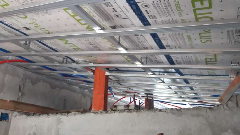 Am fi mers pe varianta de profile de aluminiu de care prindeam direct plăcile de gips carton, Dar avem nevoie de un spațiu tehnic de 10cm între vată și plăcile de gips pentru încălzirea/răcirea în tavan. Încălzire în tavan? Măi, la voi casa e cu susu-n jos!