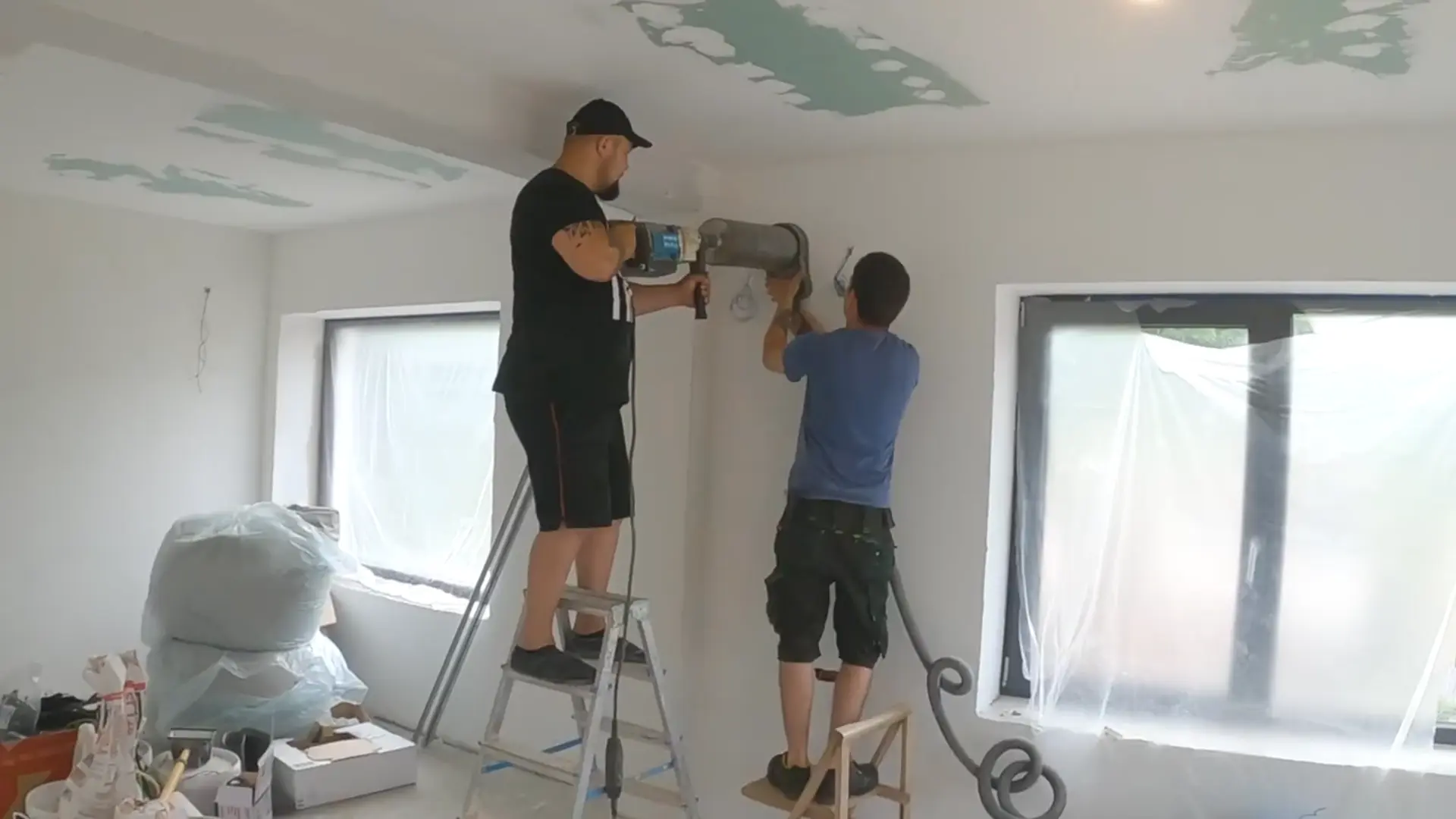 După ce am stabilit planul, noi i-am dat bătaie cu construcția și ne-am apucat de instalat echipamentele chiar înainte să dăm cu var pe pereți. Prima parte a fost să carotăm pereții.
